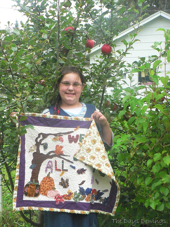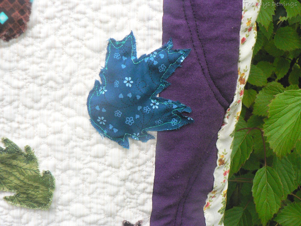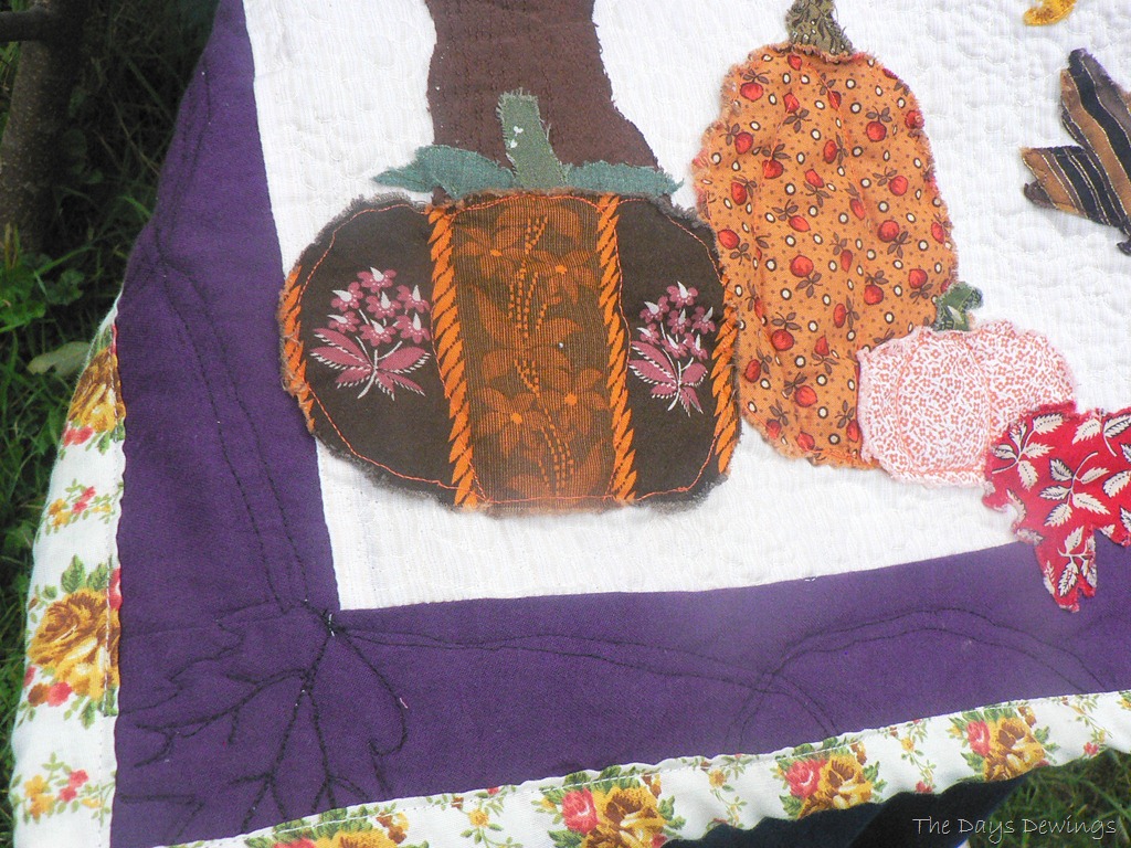 I wanted to have the leaves blowing in the wind and gathering on the ground, just like they do on a blustery day, but I did NOT want to stitch around all of those edges, turning this way and that. So I took the risk idea to applique each leaf, pumpkin, letters, and the tree with the free motion quilting foot. I like the “rugged” look of the frayed edges and the quirkiness of the stiches.